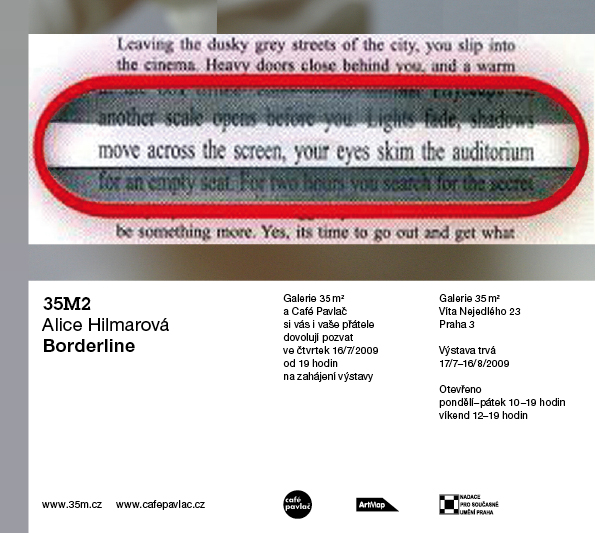 Výstavu Borderline tvoří objekty, které asociují atributy slepoty. Labyrint vyrytý do zdi snad nejpopisněji představuje cestu nevidomého člověka. Kvazi závěs z polystyrenových kuliček zase evokuje Braillovo písmo, které je zde však vnímáno ryze esteticky, pomocí zraku. Naopak obraz vytvořený na zdi galerie, rovněž z polystyrenových kuliček, osobitě zpracovává hranici mezi myšlenkou a realizací zcela bez vizuální korekce. Alice Hilmarová v něm co nejvěrohodněji odráží svou vnitřní představu, ztvárněnou prostřednictvím ostatních smyslů, především hmatu, po celodenním působení v galerii s klapkami na očích.