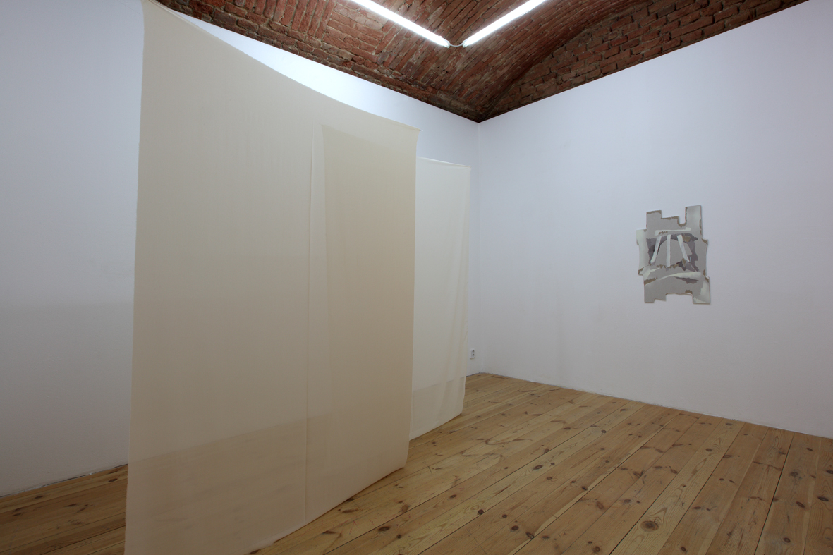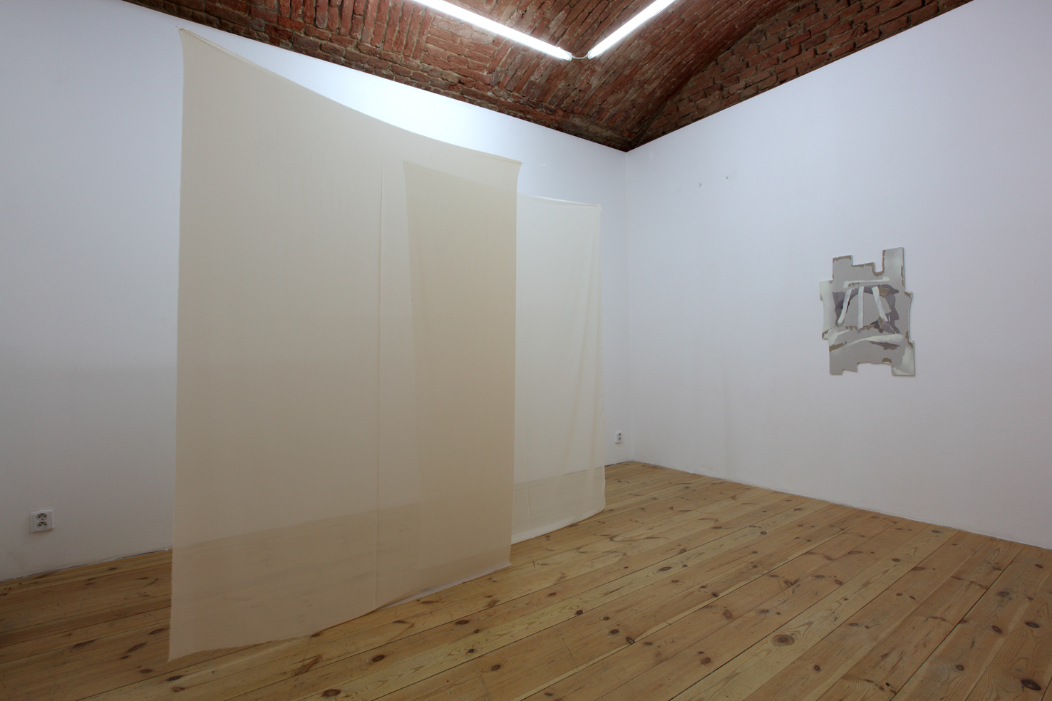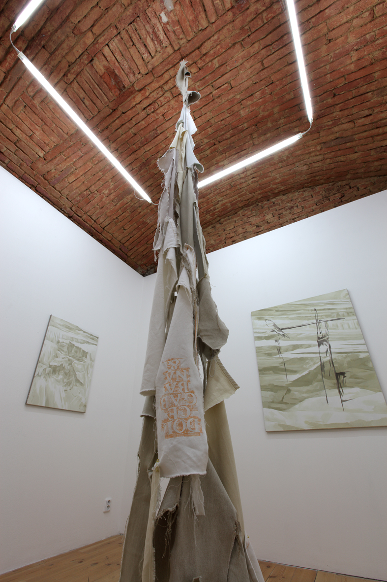Přivezl nás kamarád. Bavili jsme se cestou o věcech, každej z nás dělá něco jinýho, snažíme se to spojit, vzniká dialog, je to proces a nacházení myšlenky. Vše vzniká pro tuto příležitost, pracujem s prostorem galerie.