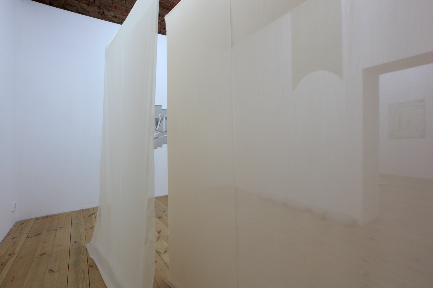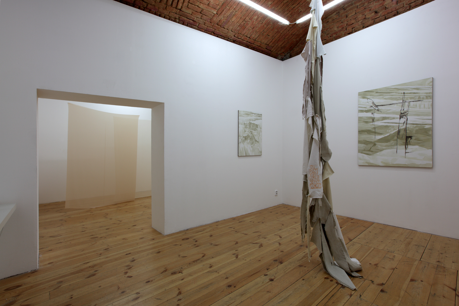 Anita v posledních měsících pracuje s látkama, s textilem. Třeba i roztrhaný rifle. Trend roztrhanejch riflí, popkultura, rozpadání. Přivezla béžový roztrhaný rifle a průhledný závěsy…