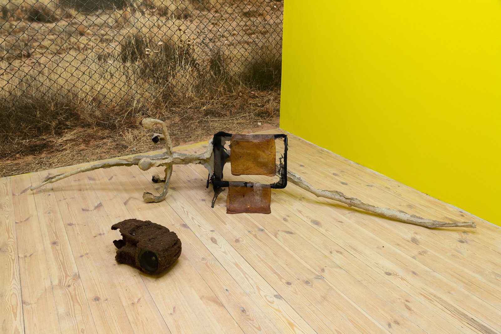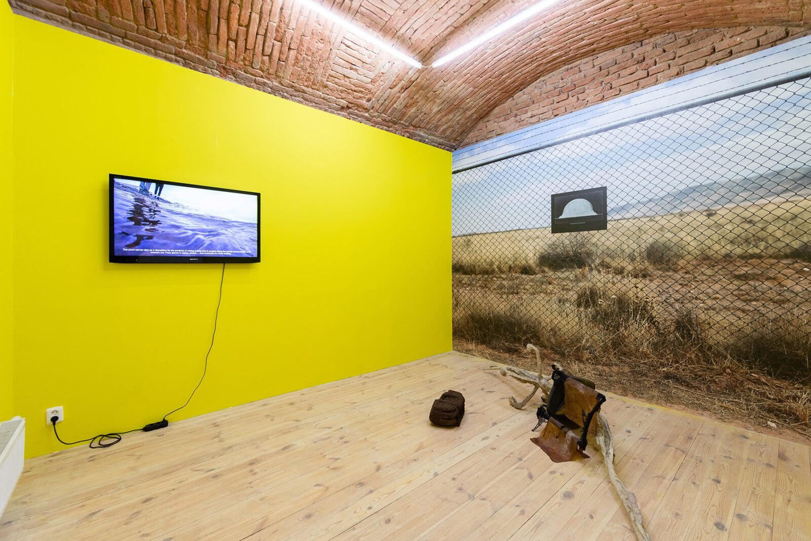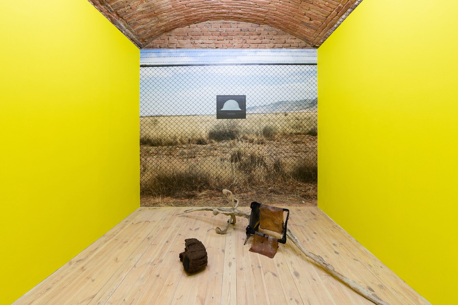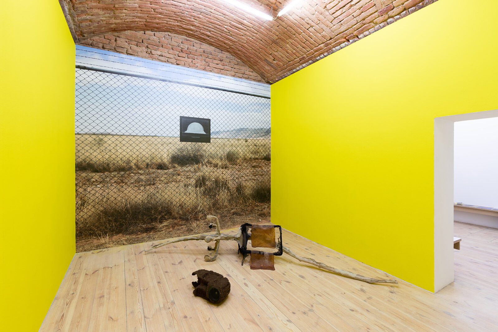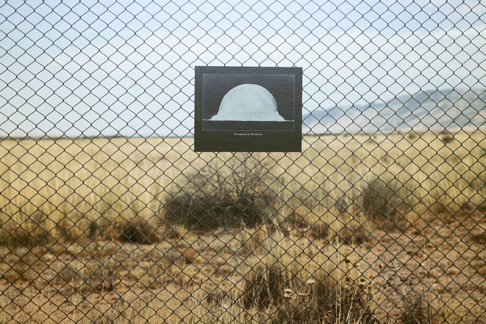 Czech-London based photographer Veronika Lukášová processes the fascination with nuclear explosions at the Trinity Site in the USA. Knowing the exact beginning of the nuclear Anthropocene, the artist went to the site 64 years later. The large-scale wallpaper reinforces the feeling of being in the place. A small photograph placed on the fence demonstrates the explosion that took place at 5:29:45 am on July 16, 1945, when the first 19-kiloton atomic bomb was tested.