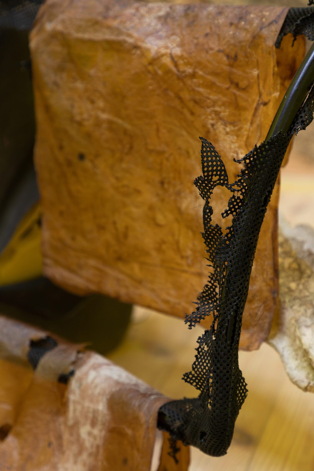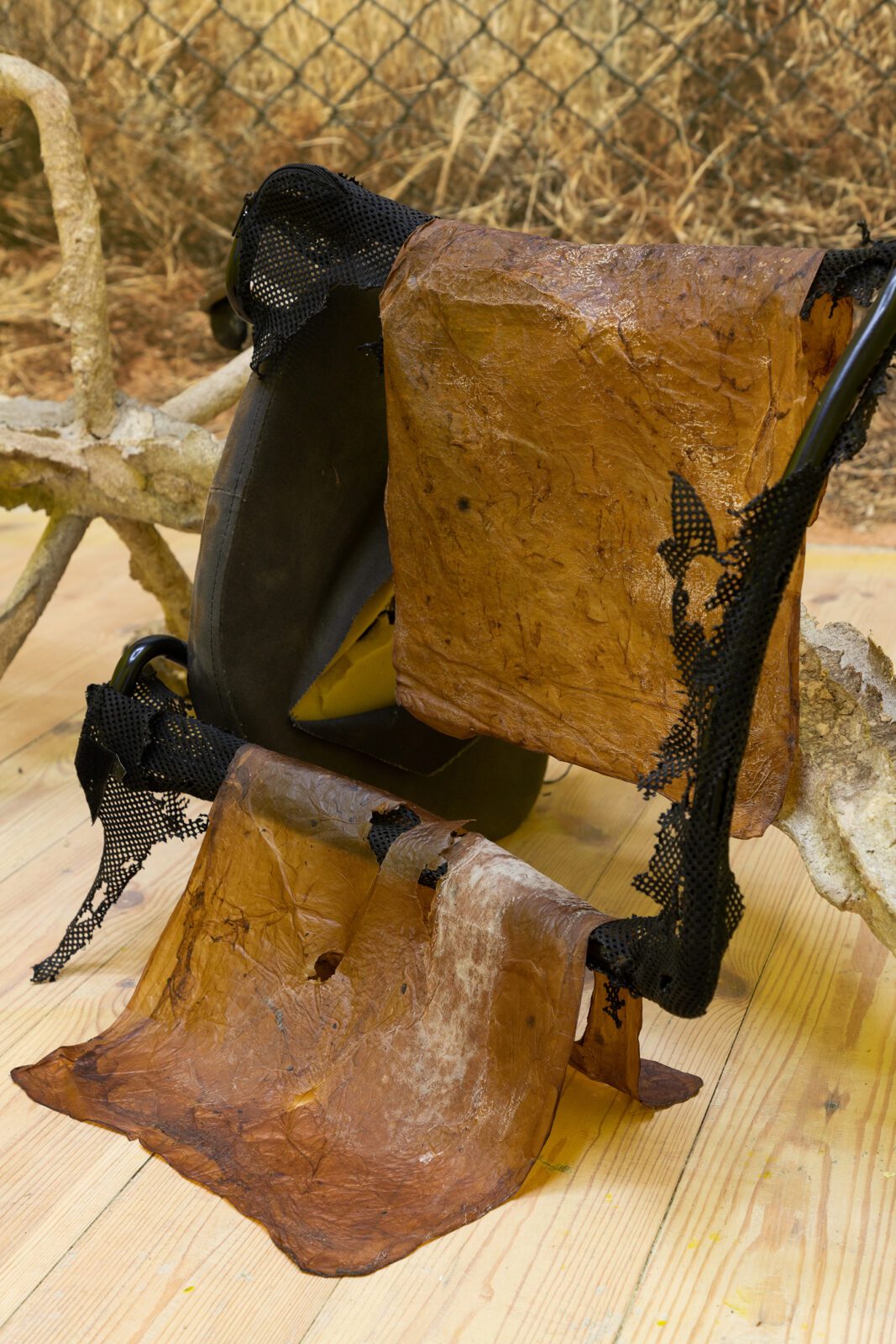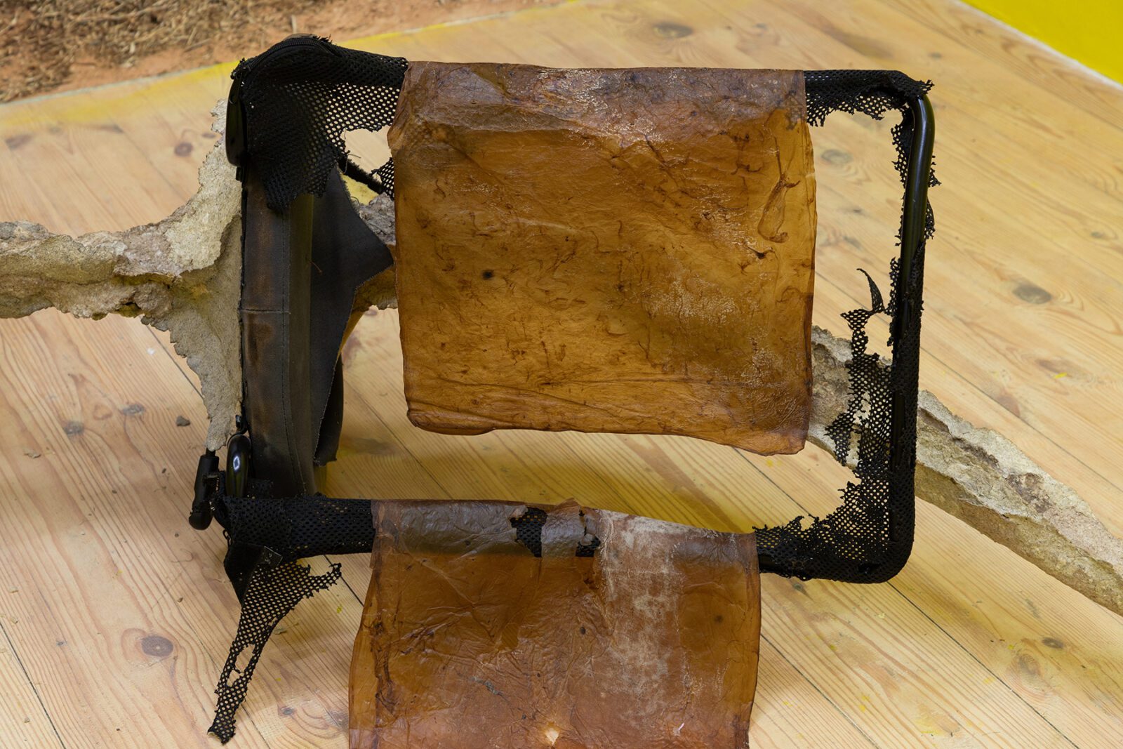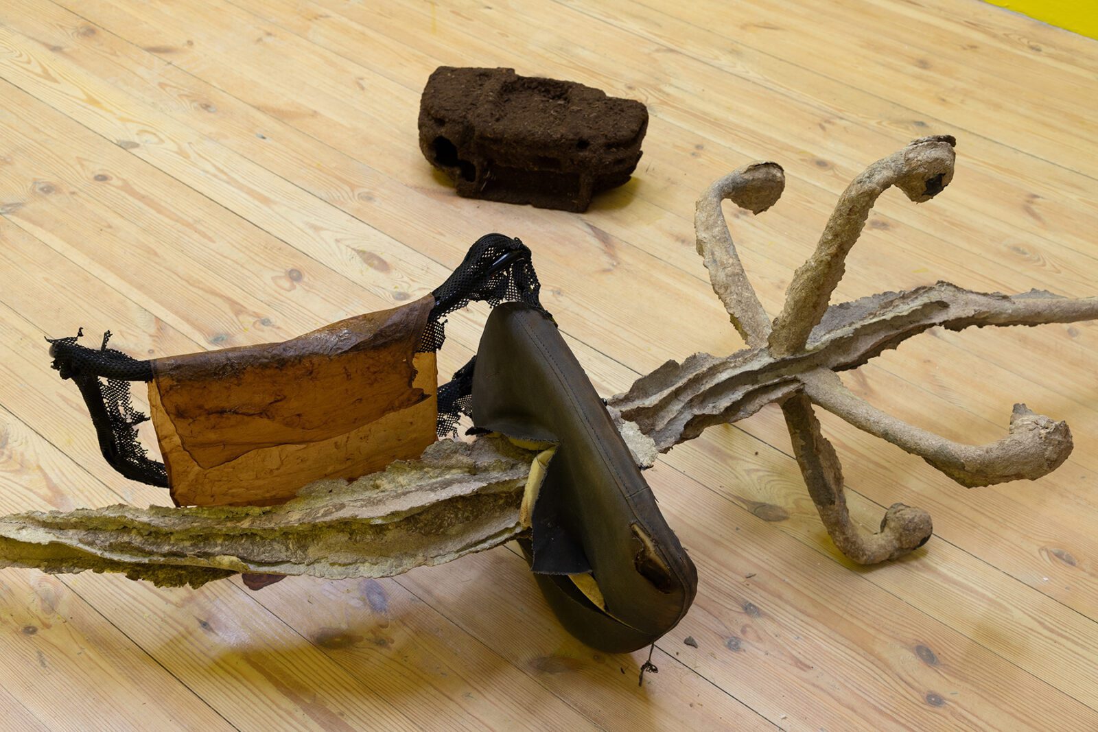 The final artist is Lithuanian artist Ruta Putramentaite, who has lived and worked in Prague for many years. The artist is presenting her sculptural installation, which is made from various recycled materials: waste, clay, sugar, bioplastic or a bicycle. The artist has long been concerned with waste as a commodity that is left behind – she reflects on the filling up of living space on our planet and where all things actually disappear to. We already know how to sort plastic, paper and sometimes even metal, but what about other things? Quite often, as we know, some of them don’t even decompose. So many times we try to give things a new life – things that are no longer meaningful to the consumer, that no longer have any value to them. In the sculptural installation “here everything is distance, there it was breath”, the artist wraps objects with her specially invented mixture, which gives additional space for species to live in the future, which can start to coexist there. The fictitious fragments of a bicycle or a loudspeaker thus point to the human materialization that gradually kills, and the question is again what it leaves to the next generations.