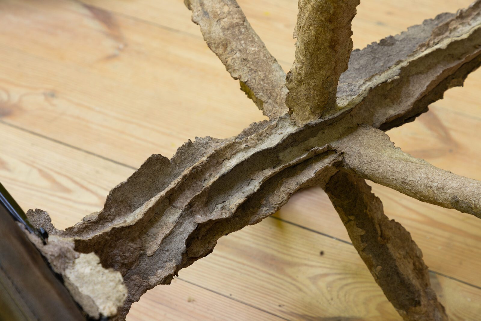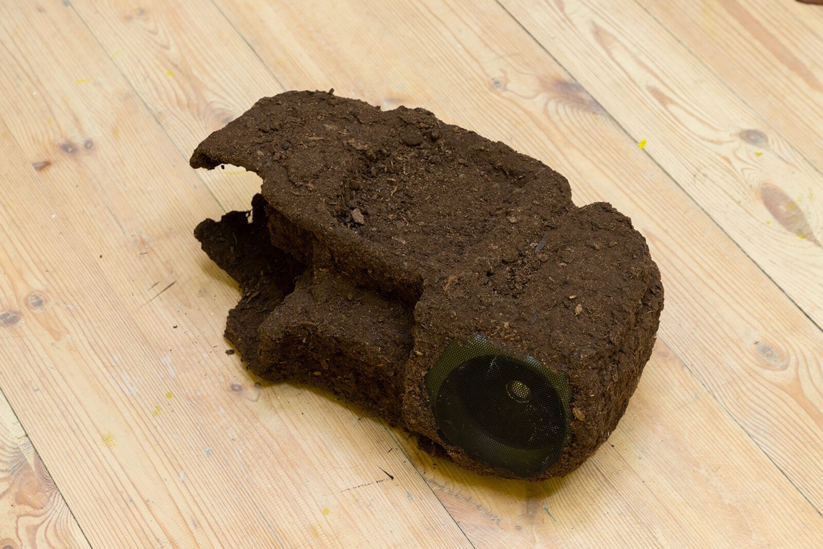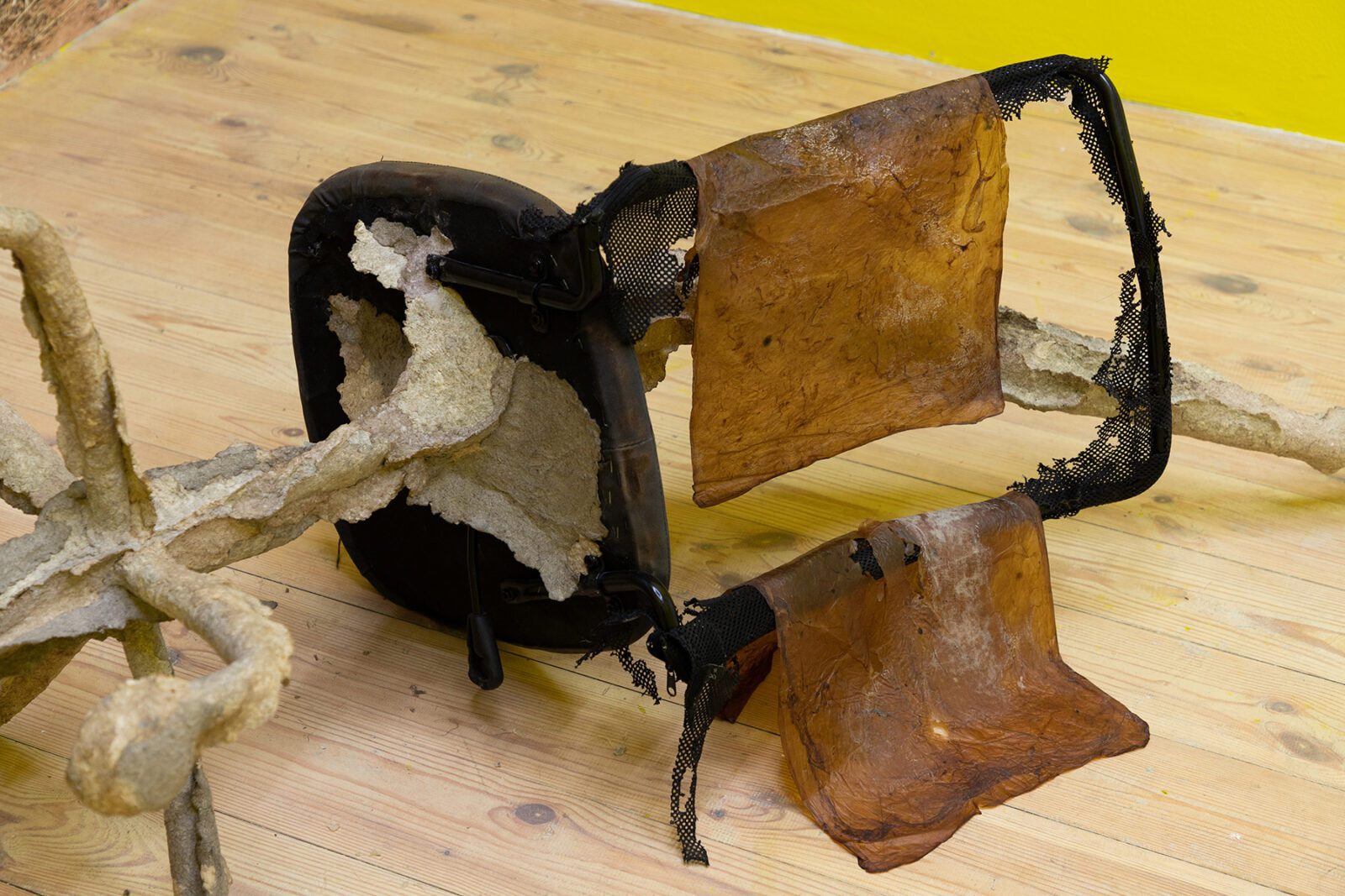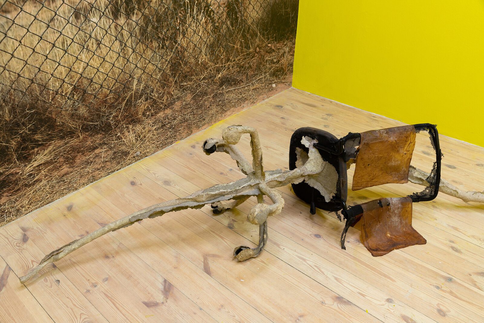 The final artist is Lithuanian artist Ruta Putramentaite, who has lived and worked in Prague for many years. The artist is presenting her sculptural installation, which is made from various recycled materials: waste, clay, sugar, bioplastic or a bicycle. The artist has long been concerned with waste as a commodity that is left behind – she reflects on the filling up of living space on our planet and where all things actually disappear to. We already know how to sort plastic, paper and sometimes even metal, but what about other things? Quite often, as we know, some of them don’t even decompose. So many times we try to give things a new life – things that are no longer meaningful to the consumer, that no longer have any value to them. In the sculptural installation “here everything is distance, there it was breath”, the artist wraps objects with her specially invented mixture, which gives additional space for species to live in the future, which can start to coexist there. The fictitious fragments of a bicycle or a loudspeaker thus point to the human materialization that gradually kills, and the question is again what it leaves to the next generations.