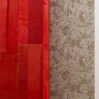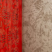 Like the previous exhibition, the Oriental character of Soya Stream draws on the aesthetics of chinoiserie, a concept that among other things has been associated with the import of East Asian art into Europe since the 17th century. From the perspective of today’s consumer society, the subsequent crisis of European artistic craftsmanship resulting from a surplus of imported goods from these countries appears like an unstoppable and constantly repeating process. Among other things, this process is also reflected in the choice of material – the wooden structures are covered in textiles purchased from bankrupt stores. Another reference to market mechanisms is the repeated use of a deformed version of the Chinese symbol for prosperity and financial gain. What on the surface appears to be a painted spatial situation thus hides a slowly creeping, ever-increasing atmosphere of collapse, crisis, and uncertainty.