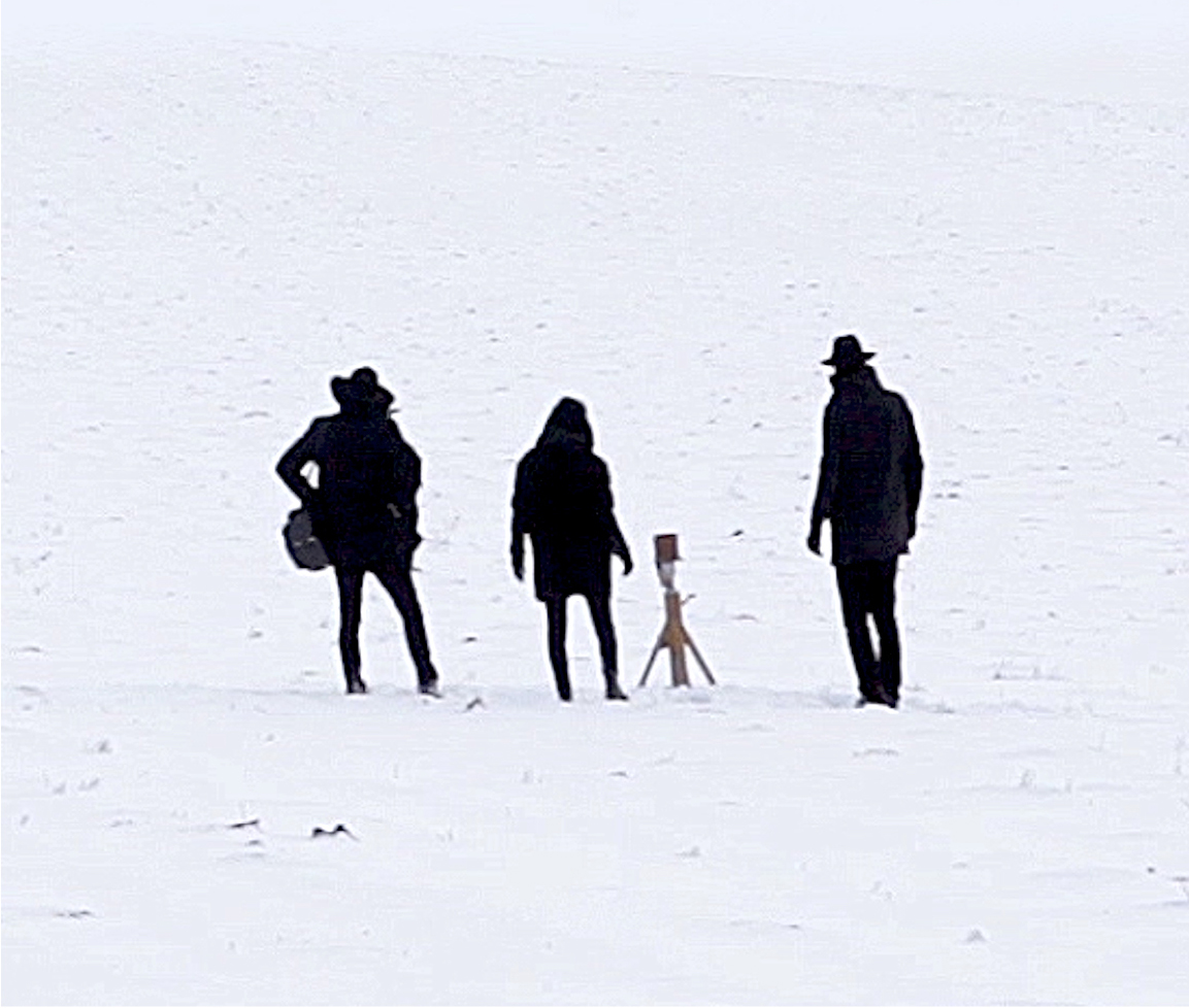 To capture chance. It elusively churns the white space, mixing with snowflakes, turning the mountain. What turns the mountain? Three black figures appear in a cathartic abyss, seeking a new landscape. Their interest is the mountain before them. A mountain that is solitary at its peak, although who knows what paths it follows underground, in layers hidden to man which the figures cannot possibly imagine? We would like to be such a mountain – proud, dignified, solitary with a few faithful leaf-covered friends. It is winter. Persephone is hiding in the underworld, tears frozen in grief. People have a strange relationship to the landscape. It is a polarity – black and white. Who influences whom? Are the people filming the mountain with their strange machine, or has it beckoned them so that it may reveal itself to them from all its sides? Is it a ridiculous, a threatening, a pleading act? The creation of tension.