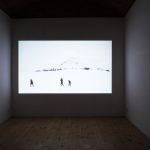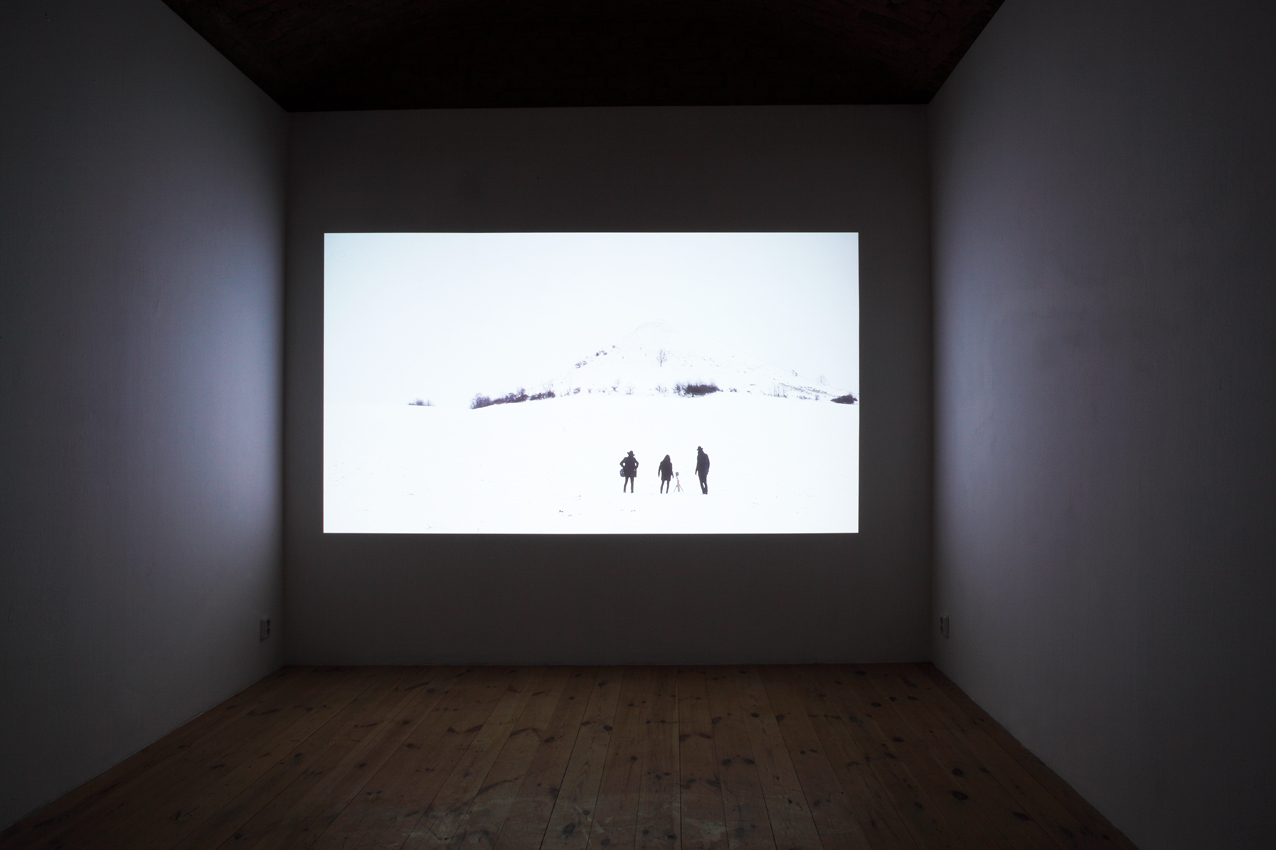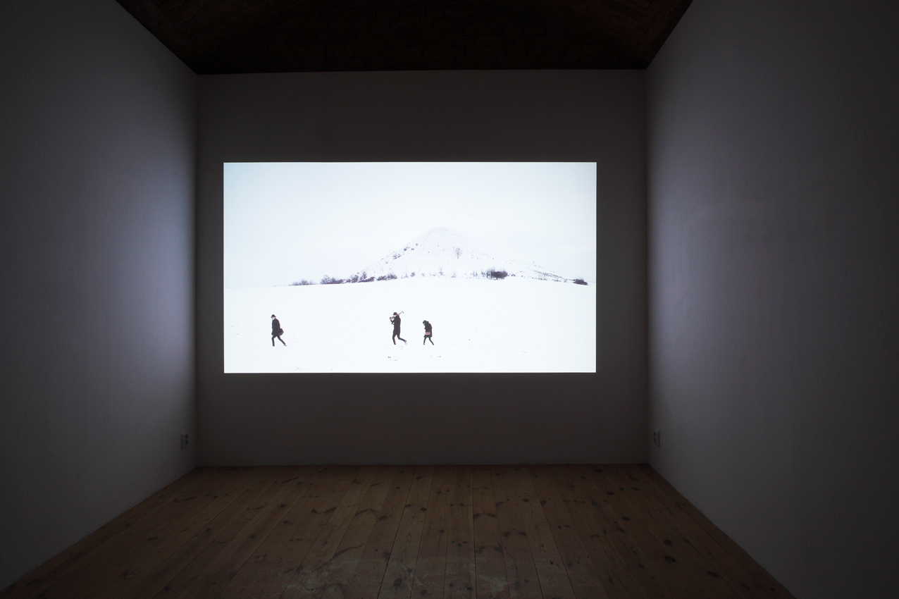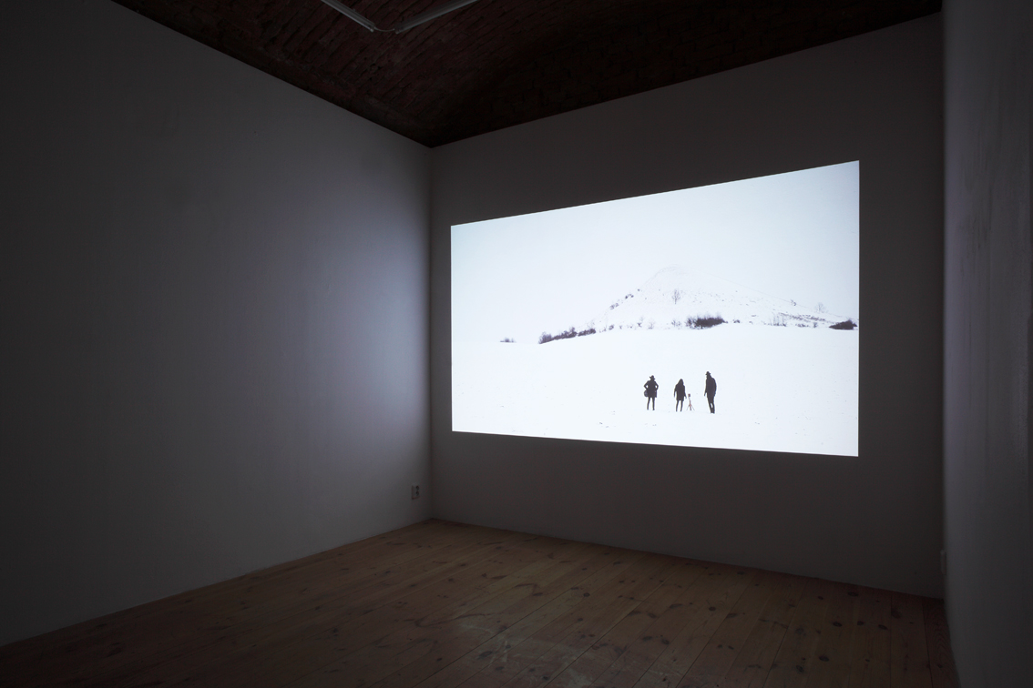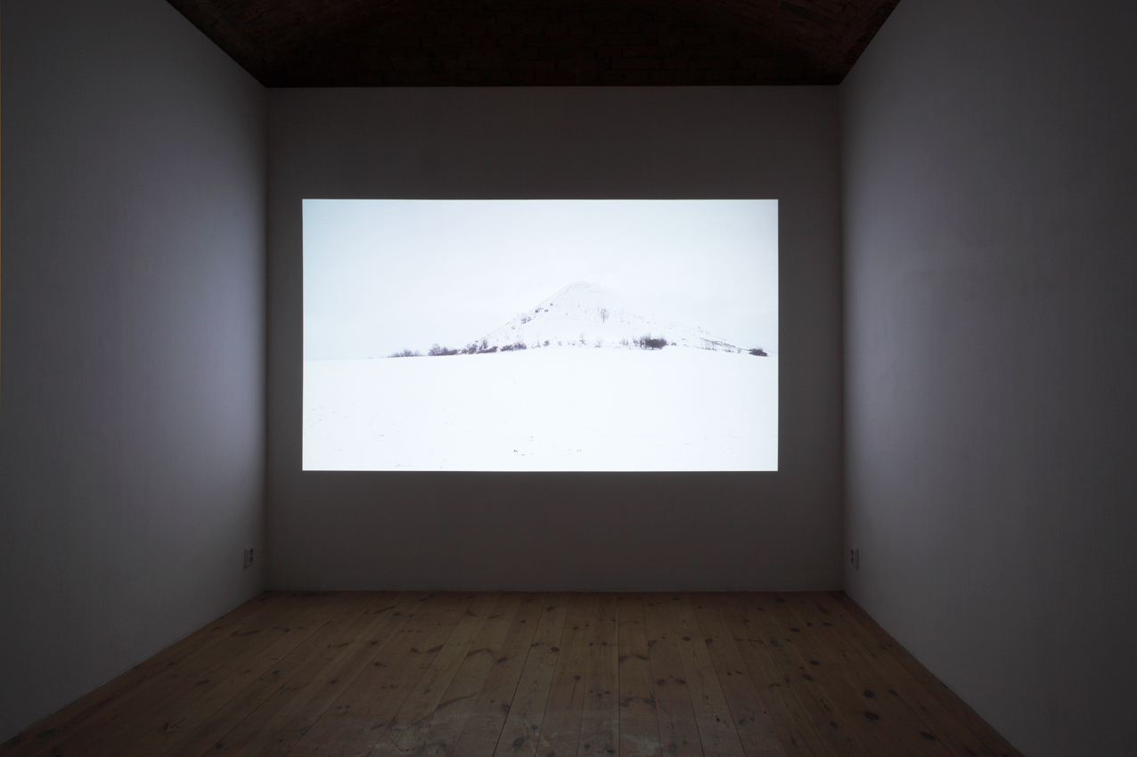 Man and his relationship to the surrounding landscape are a regular motif in the work of Lea Petříková. It is always slightly different, but at its core it is always a delicate and contemplative poetry drowning in timelessness. The people are without name, symbols whose origin begins and ends beyond the margins of the images. The motifs are inspired by literature, painting, nature. In Filming a Mountain (2016), the starting point is the artist’s eponymous poem and her personal relationship to the landscape where the story takes place. The Footprint (2017), which makes its debut at Galerie 35m2, is loosely inspired by the eponymous story by Karel Čapek in which two people meet by a solitary footprint in the snow after a storm but, unable to determine its origins, grow silent. Both videos evoke a frozen moment existing on the boundary between reality and dream, lightly flowing with an intimated narrative. The title of the exhibition, The Less I Look, the More I See, indicates that the true story takes place not in the image itself, but circles around it behind a semi-transparent veil. Both works presented at the exhibition seek a kind of undefined third agent hidden within an intangible haze, one that insists on existing in our imagination. To darken the tale, to reverse hesitation.
