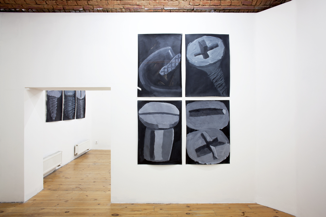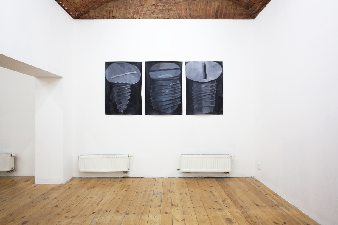 Marek Tischler has successfully avoided the more lofty forms of art and turns his back on higher matters in life. He is more likely to transform the world around him into a work of art, and so the chosen motifs of his paintings are the most elemental of objects, which he uses as a means for experimenting with shapes. The rules and purpose of this game depend on our intimate knowledge of ordinary items and especially their function. He is capable of producing a captivating image with just the simplest use of color and his typical caricature style. His cycle of monothematic paintings on the subject of screws, bolts, and other fasteners is more than just an aesthetic range of nuances of intensity and degree – it is primarily an old-fashioned way of identifying the importance or even superiority of the concept of repetition, an understanding of the fact that two same things differ from one another or are identical or are in some way related or could even form a meaningful pair, group, or whole that holds our world together.