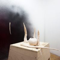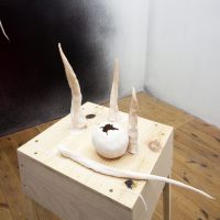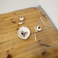 In order to introduce the art of Nik Timková and to describe her exhibition, we will have to share a personal story. Her black cat is a great hunter who is constantly bringing home the remains of what she catches, such as bird bones and rat tails. The tails freaked Nik out – no, she didn’t climb up on a chair, but she found herself gripped with anxiety. Rats are swift and stealthy, capable of running out from behind a corner when we least expect it. But Nik’s black cat is quicker, and so all that remains of the rat is its tail. Since it is in the nature of a hunter to hunt, Nik had to somehow come to terms with the rat tails, and so she began to mold them in clay and create little sculptures of them.