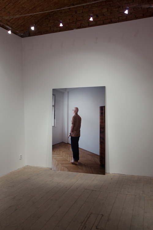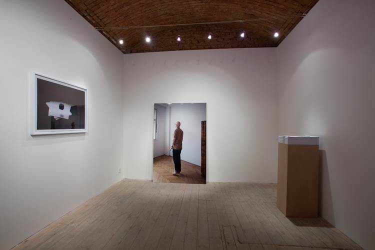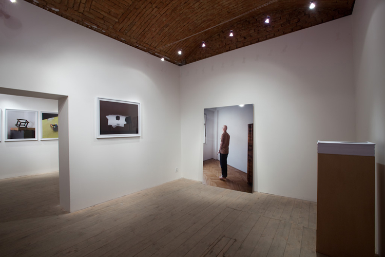 Výstavu uvádí fotografie zobrazující postavu stojící v místnosti bez nábytku na jedné noze. Muž hledí z okna, do hloubky jiného prostoru a pozoruje cosi mimo obraz. Volba zorného úhlu může vytvářet iluzi levitace postavy, ale viditelné a podstatné je prosté vyvažování jejího vertikálního pohybu skrytou nohou. Je tu zachycena obecná zkušenost gravitace ve vztahu s obtížemi při pozorování. Téměř banální moment přesně definuje vnímání prostoru v jeho důležité dimenzi – jako bezprostřední tělesný zážitek.