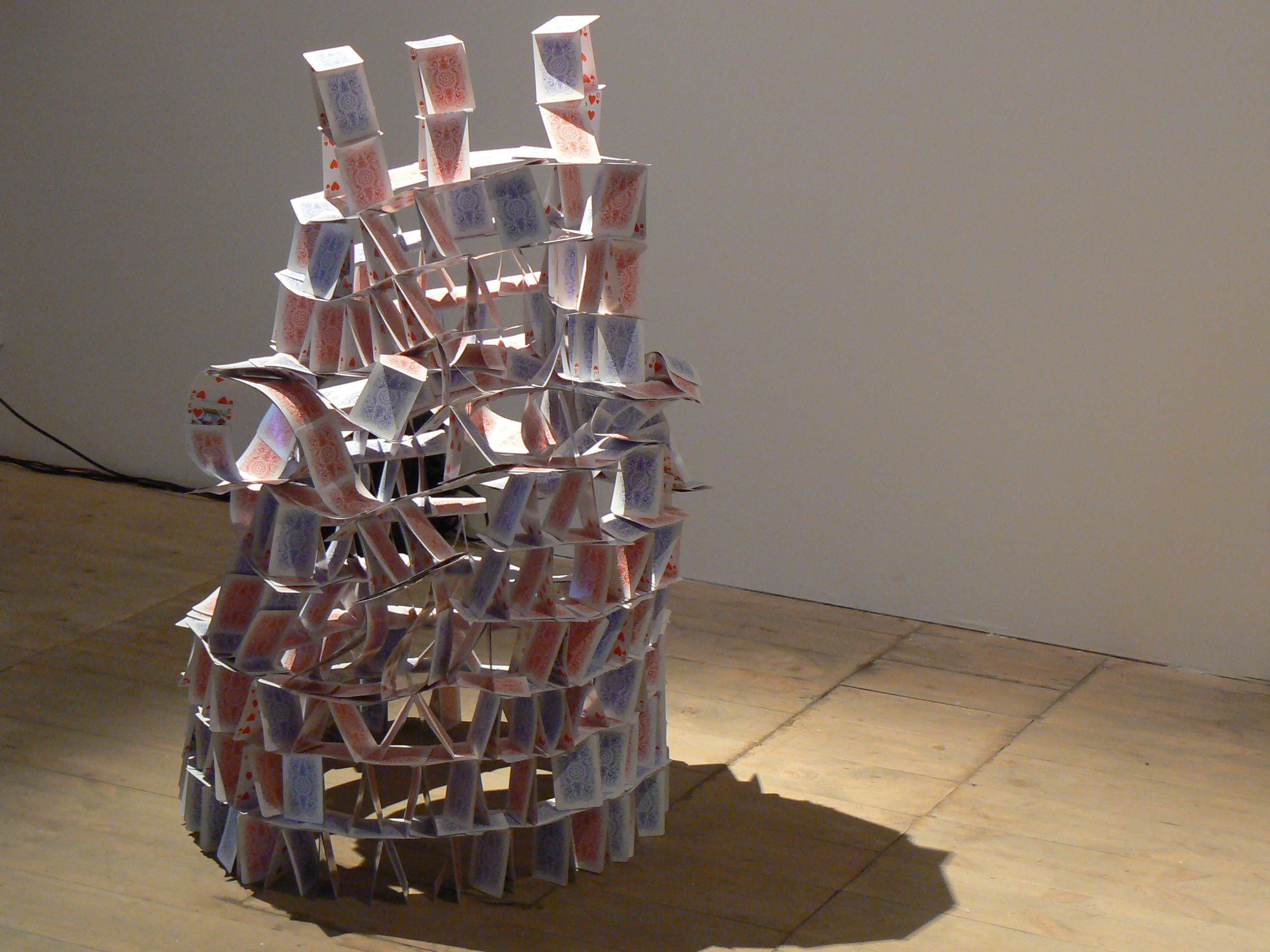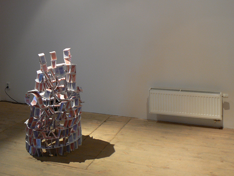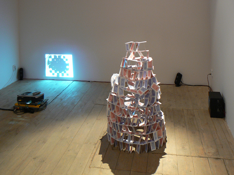 Další dvě práce – video a objekt – rozvíjí symboliku domova, bezpečí nebo důležitosti životních podmínek jako je pevnost a stabilita. Tyto hodnoty, jež mohou být předmětem naší touhy, jsou paradoxně vyjádřeny nestálým geometrickým polem vyrobeným z vosku a labilní papírovou architekturou. Šachový vzor a srdcový karetní element jsou znaky dvou her, které jsou si velmi blízké, protože kdysi tvořily jednu hru dohromady. Karty byly původně součástí šachové hrací desky a až později se od ní osamostatnily. Možná i o tom by mohl být text smutné písně, na jejíž slova a jejich význam si musíme rozpomenout a která nás po celou dobu na této výstavě pronásleduje.