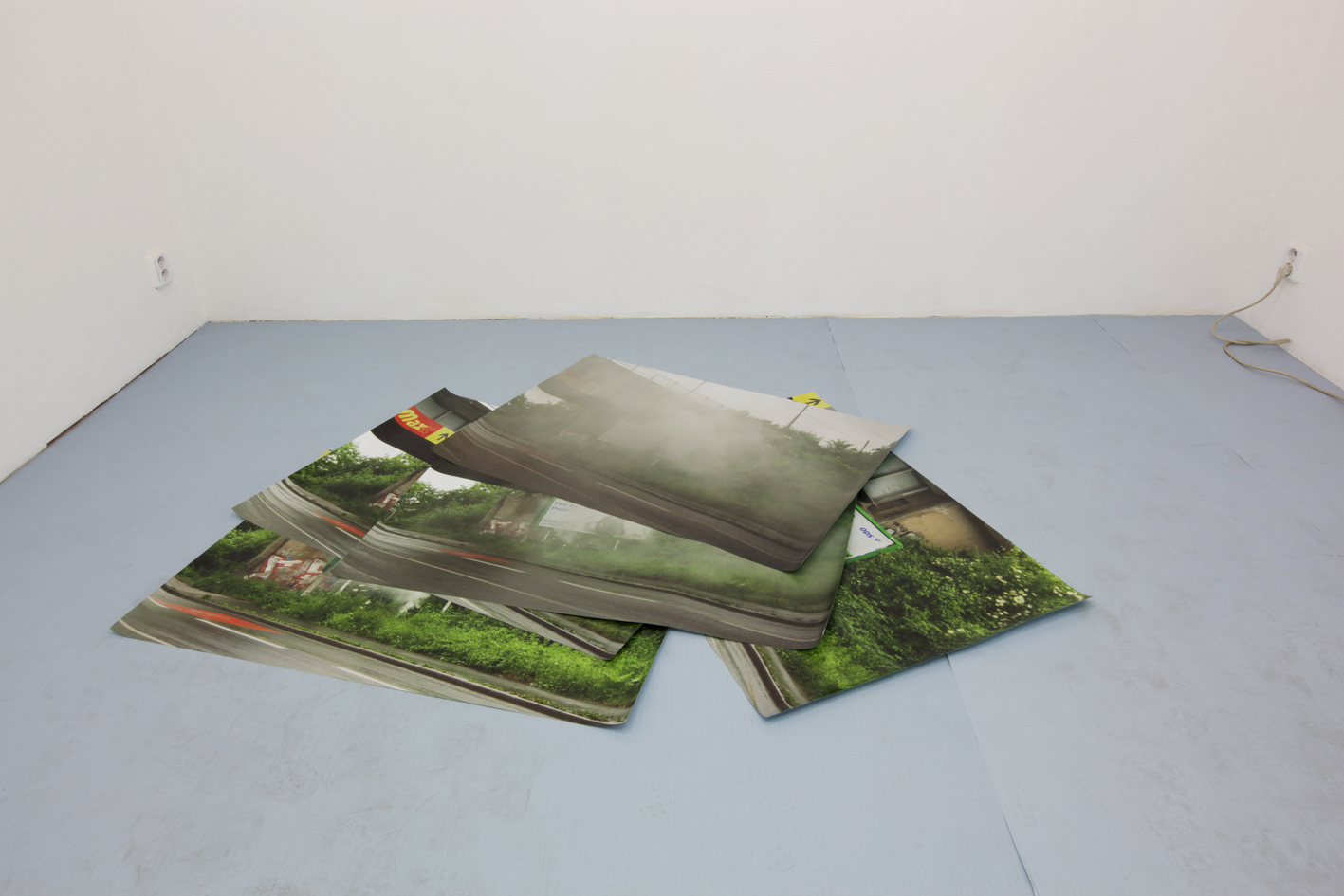 Výstava Markéty Kinterové v Galerii 35m2 bezprostředně souvisí s jejím umísťováním fotografických obrazů v městské krajině a zejména s jejími aktuálními Billboardbooks. Billboardu ponechává jeho původní význam a mýtotvornost, zachází s ním jako s typickým znakem naší žité společnosti, ekonomickým kultivátorem citlivosti mas a s všydypřítomnou non stop projekcí toho, čím by společnost „měla/ chtěla být“. Tento majestátní znak ztělesněný obrazem náležící svým obvyklým umístěním do zvýšeného nadzemního pole tu je zkoumán prostřednictvím jakési lidové kreativity vyvěrající opačným, tedy spodním proudem. Ten má probouzet naší zvědavost vědět to, co je za tímto mechanizovaným obrazem a také touha tento pohled za obraz pročistit. Médium billboardu se v této instalaci představuje v několika variacích. Jako přímá definice místa s pomocí materiálu umístěného na podlaze galerie, jako romantizující vzpomínka na jeho nevinné stadium v podobě transparentní konstrukce nebo jako oslabený článek, který zmizí díky pouhému dýmu.