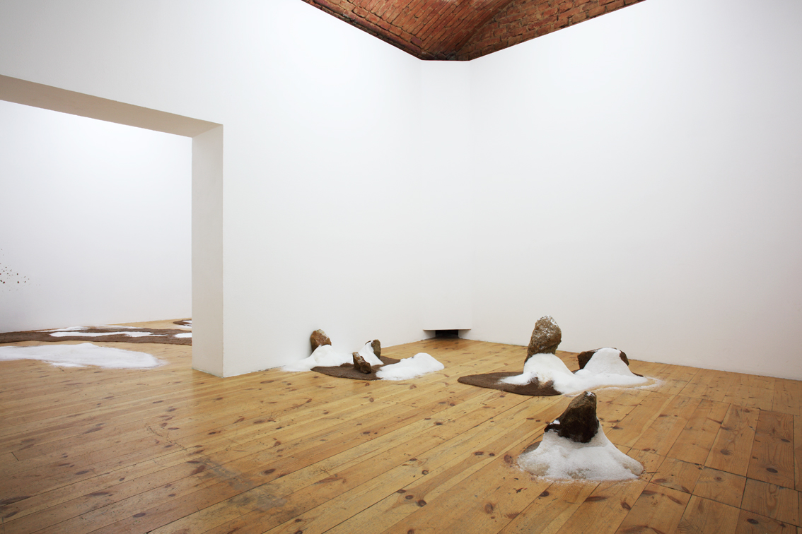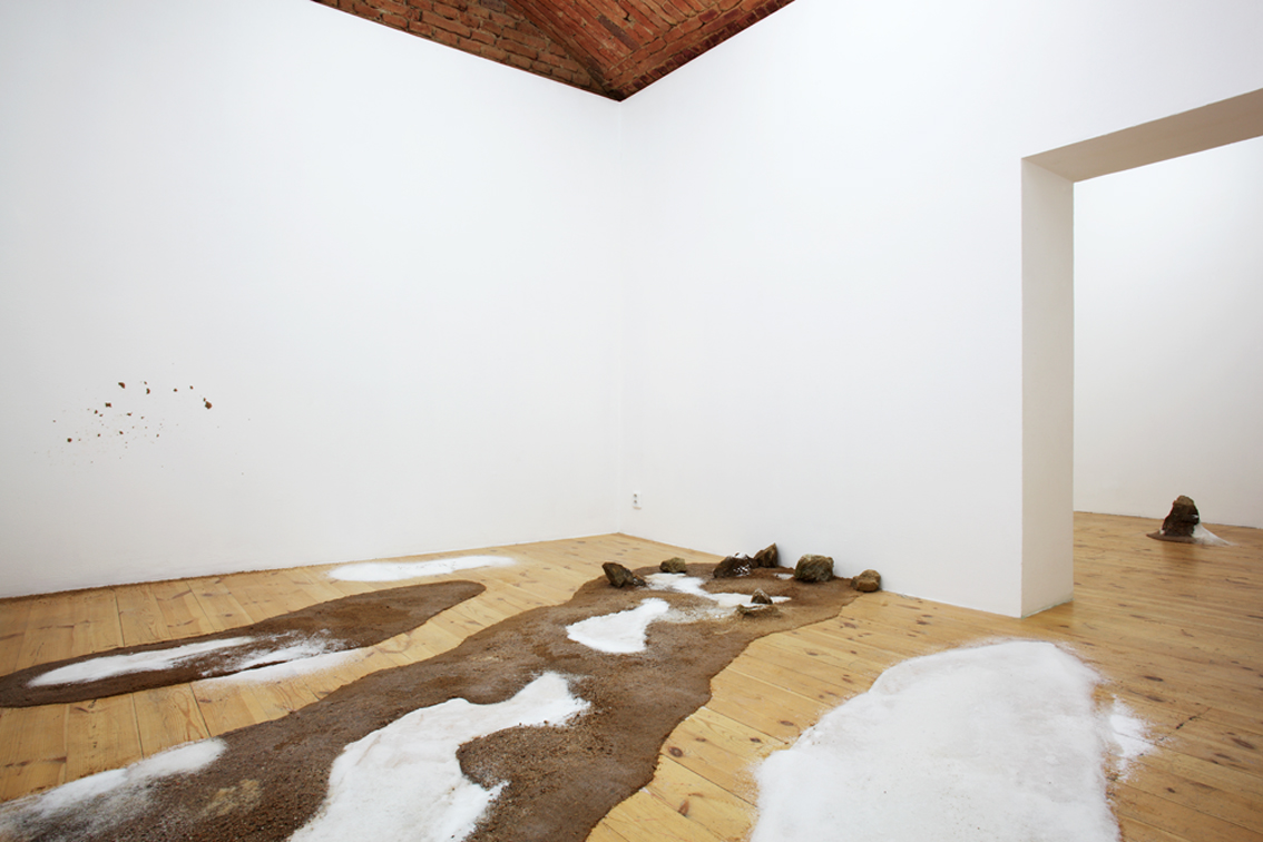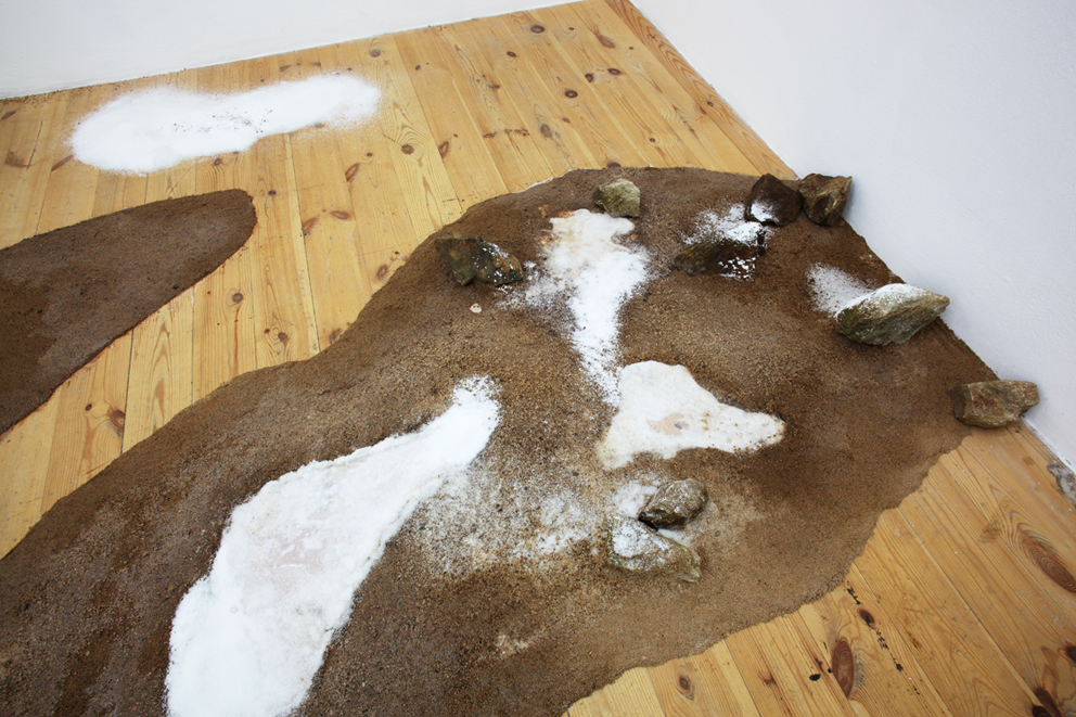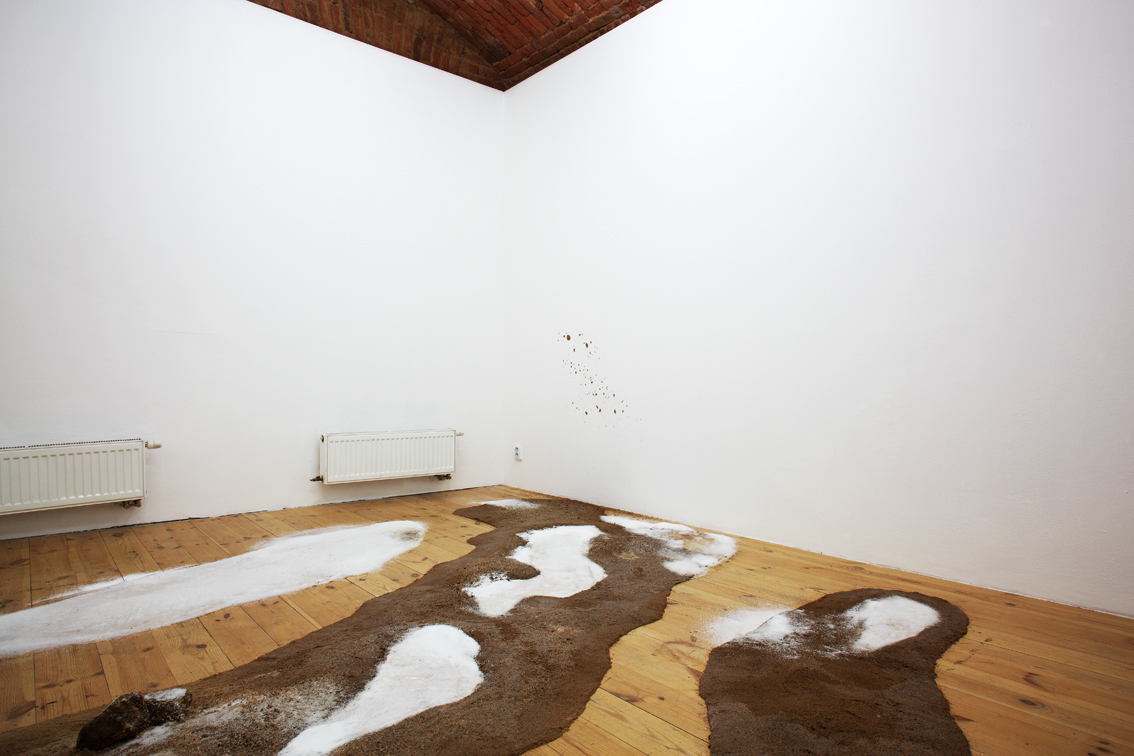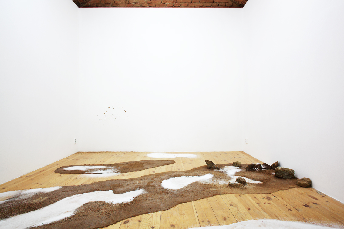 Výstava s názvem Vlna veliká, hora vysoká je tak trochu slovní hříčkou a protikladem, se kterými Markéta Souhradová (1989) pracuje ve své instalaci. Fascinována přírodním materiálem, změnou měřítka a proměnou, která se odehrává v nepozorovatelném aktu, viděna až v průběhu času. Podobnou proměnu či proces lze najít i v pracích autorů Gabriela Orosca, Mattea Rubbyho či Mariele Neudecker. Souhradová však vytváří svoji imaginární krajinu, kterou si racionálně sestavila ze vzpomínek z dětství, z her, z cest a zážitků. Přestože autorčina instalace působí primárně vizuálně a svým způsobem poeticky, vidím v ní nepřímou hrozbu našeho globálního oteplování. Odpařování, efekt mrtvé vody, kdy se smísí slaná voda se sladkou, nedostatek podzemních vod či vysychání. Proces, který tak trochu každý pozoruje z dálky, jakoby se nás ani netýkal. Co když tohle už není experimentem, jaký využívá Souhradová při své práci smísením materiálů? Co když je to stesk po nemožnosti zastavit procesy, které se rozběhly, aniž bychom o ně stáli? Jak se tedy nejlépe postavit na vlnu, aby nás svezla?