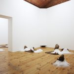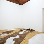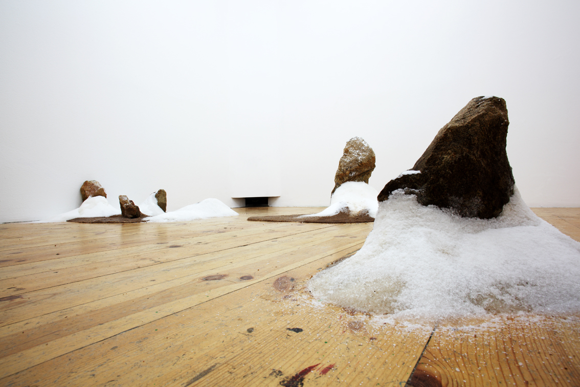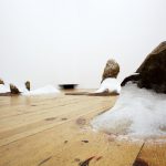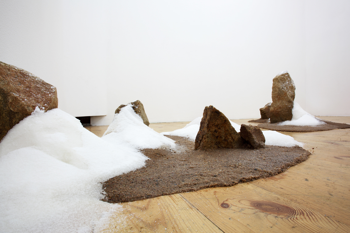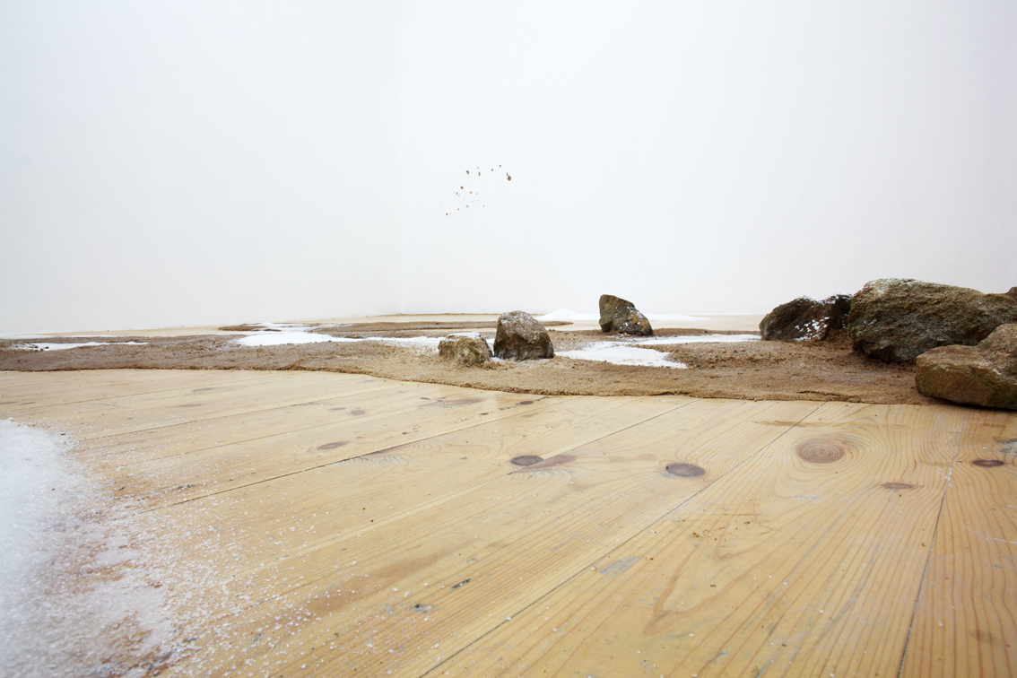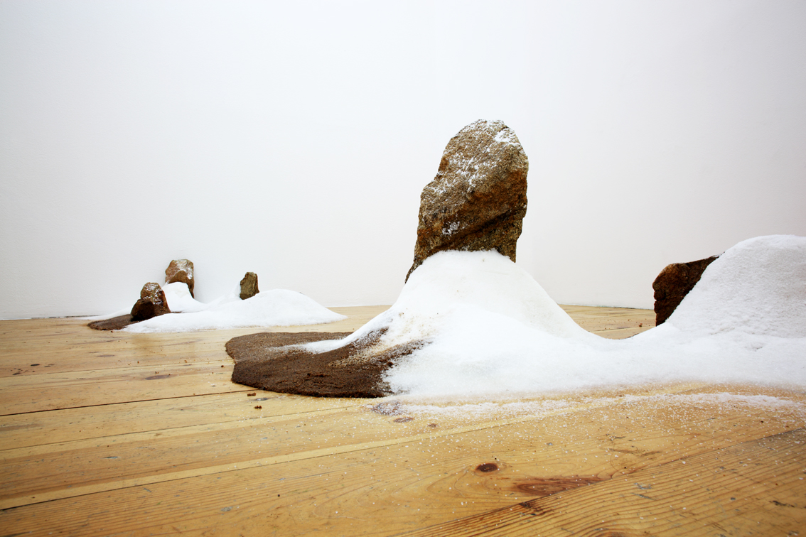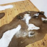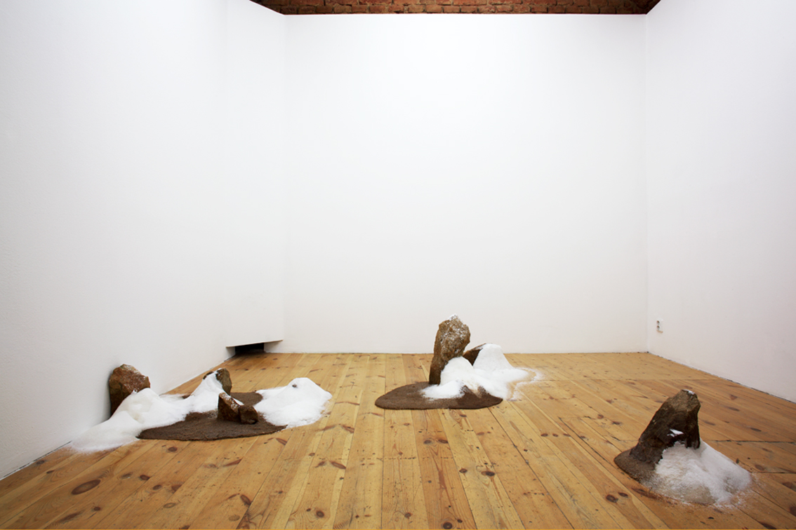 Výstava s názvem Vlna veliká, hora vysoká je tak trochu slovní hříčkou a protikladem, se kterými Markéta Souhradová (1989) pracuje ve své instalaci. Fascinována přírodním materiálem, změnou měřítka a proměnou, která se odehrává v nepozorovatelném aktu, viděna až v průběhu času. Podobnou proměnu či proces lze najít i v pracích autorů Gabriela Orosca, Mattea Rubbyho či Mariele Neudecker. Souhradová však vytváří svoji imaginární krajinu, kterou si racionálně sestavila ze vzpomínek z dětství, z her, z cest a zážitků. Přestože autorčina instalace působí primárně vizuálně a svým způsobem poeticky, vidím v ní nepřímou hrozbu našeho globálního oteplování. Odpařování, efekt mrtvé vody, kdy se smísí slaná voda se sladkou, nedostatek podzemních vod či vysychání. Proces, který tak trochu každý pozoruje z dálky, jakoby se nás ani netýkal. Co když tohle už není experimentem, jaký využívá Souhradová při své práci smísením materiálů? Co když je to stesk po nemožnosti zastavit procesy, které se rozběhly, aniž bychom o ně stáli? Jak se tedy nejlépe postavit na vlnu, aby nás svezla?