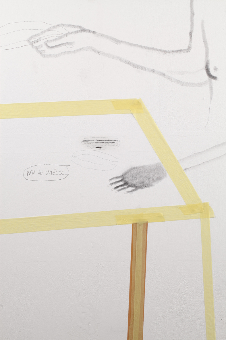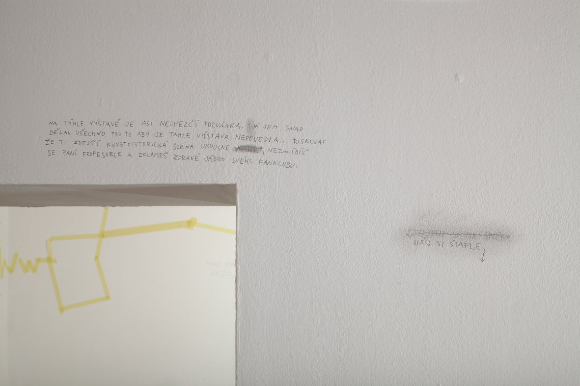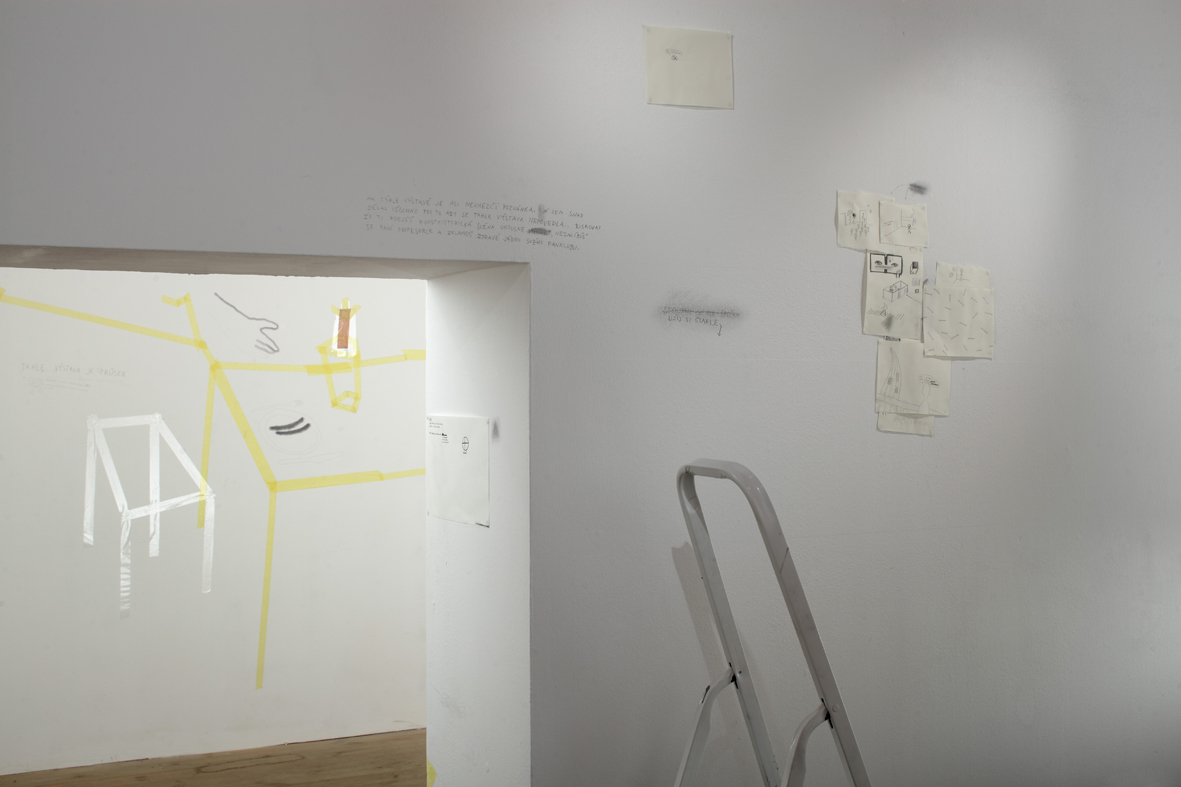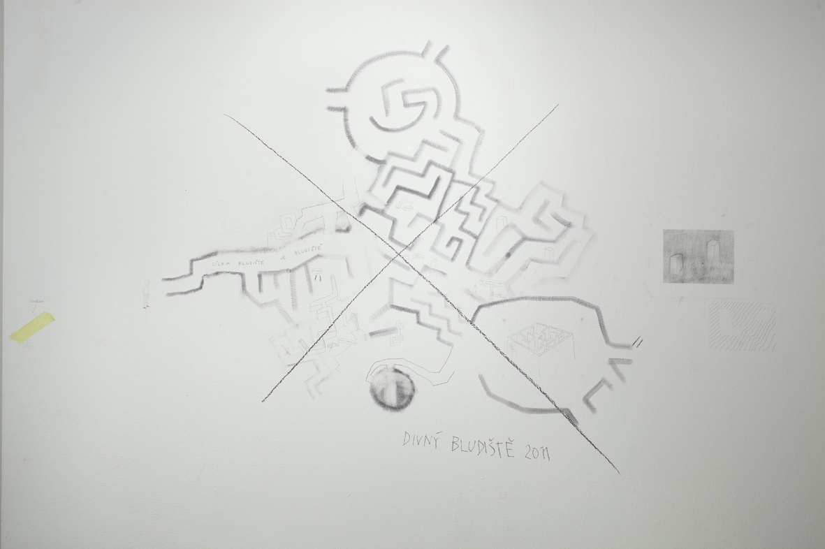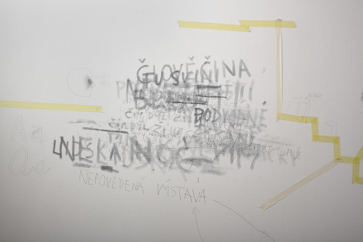 Dobrovolně a zevnitř uzamčený autor tvaru, jenž se této činorodé izolaci podrobil, letos diplomuje v ateliéru kresby na pražské AVU, což je příznivá shoda okolností. Společně s ním jsme si totiž kurátorsky a v přátelském duchu vytyčili skromný cíl, mající podobu výstavy, jež vzniká prakticky z ničeho a během krátké doby. Odborně řečeno se jedná o takzvanou otevřenou formu, která se může organicky, neplánovaně, čili bez jistých záruk o výsledku, vyvinout naprosto libovolným směrem.