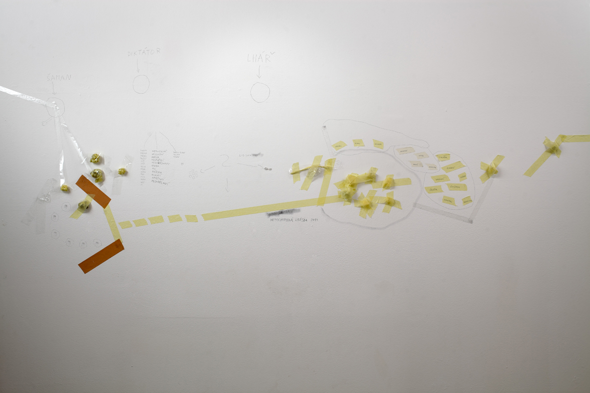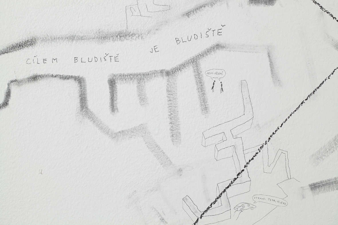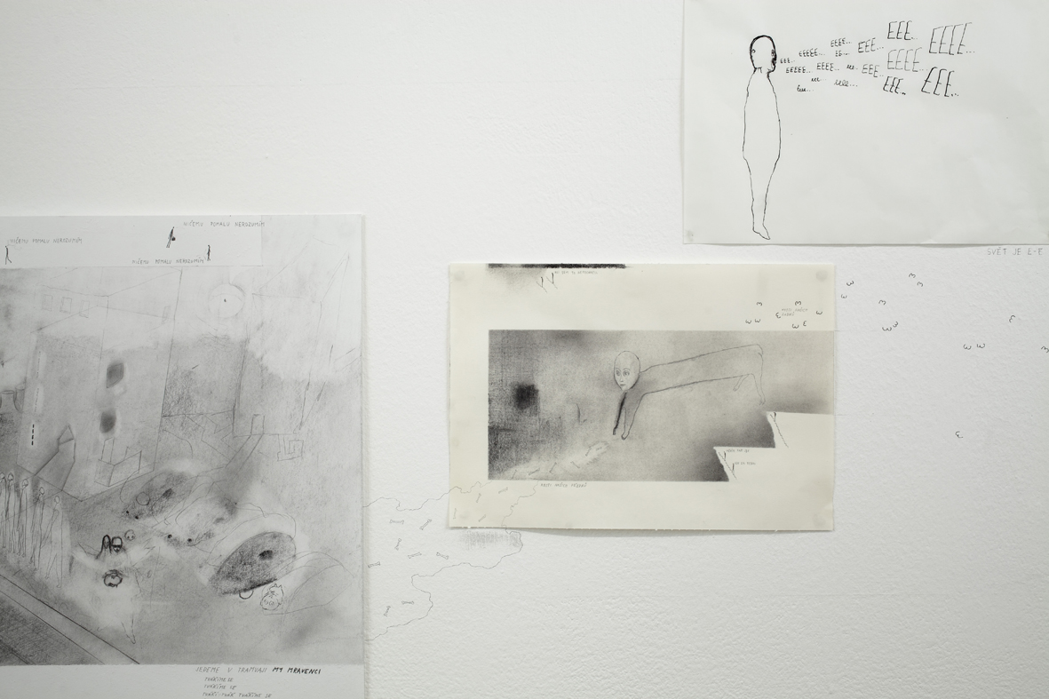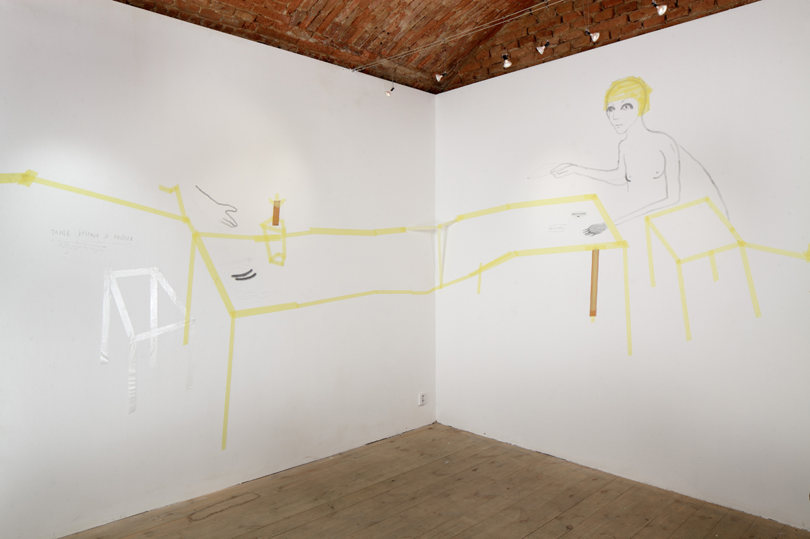 Dobrovolně a zevnitř uzamčený autor tvaru, jenž se této činorodé izolaci podrobil, letos diplomuje v ateliéru kresby na pražské AVU, což je příznivá shoda okolností. Společně s ním jsme si totiž kurátorsky a v přátelském duchu vytyčili skromný cíl, mající podobu výstavy, jež vzniká prakticky z ničeho a během krátké doby. Odborně řečeno se jedná o takzvanou otevřenou formu, která se může organicky, neplánovaně, čili bez jistých záruk o výsledku, vyvinout naprosto libovolným směrem.