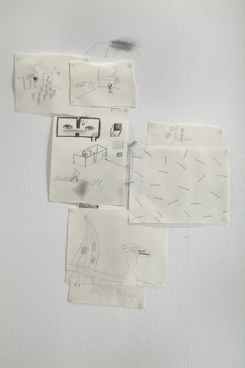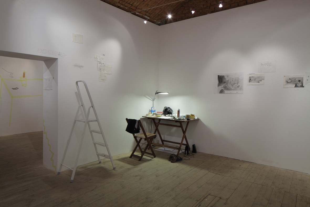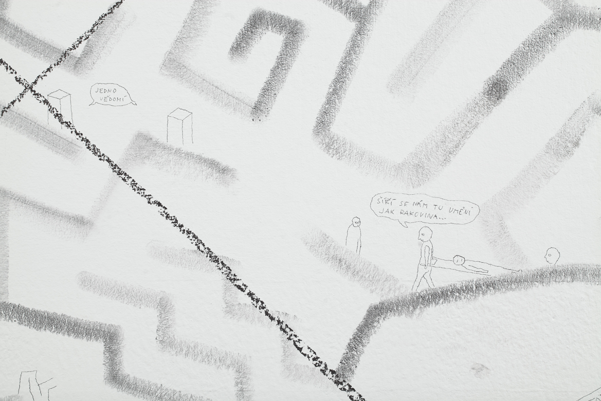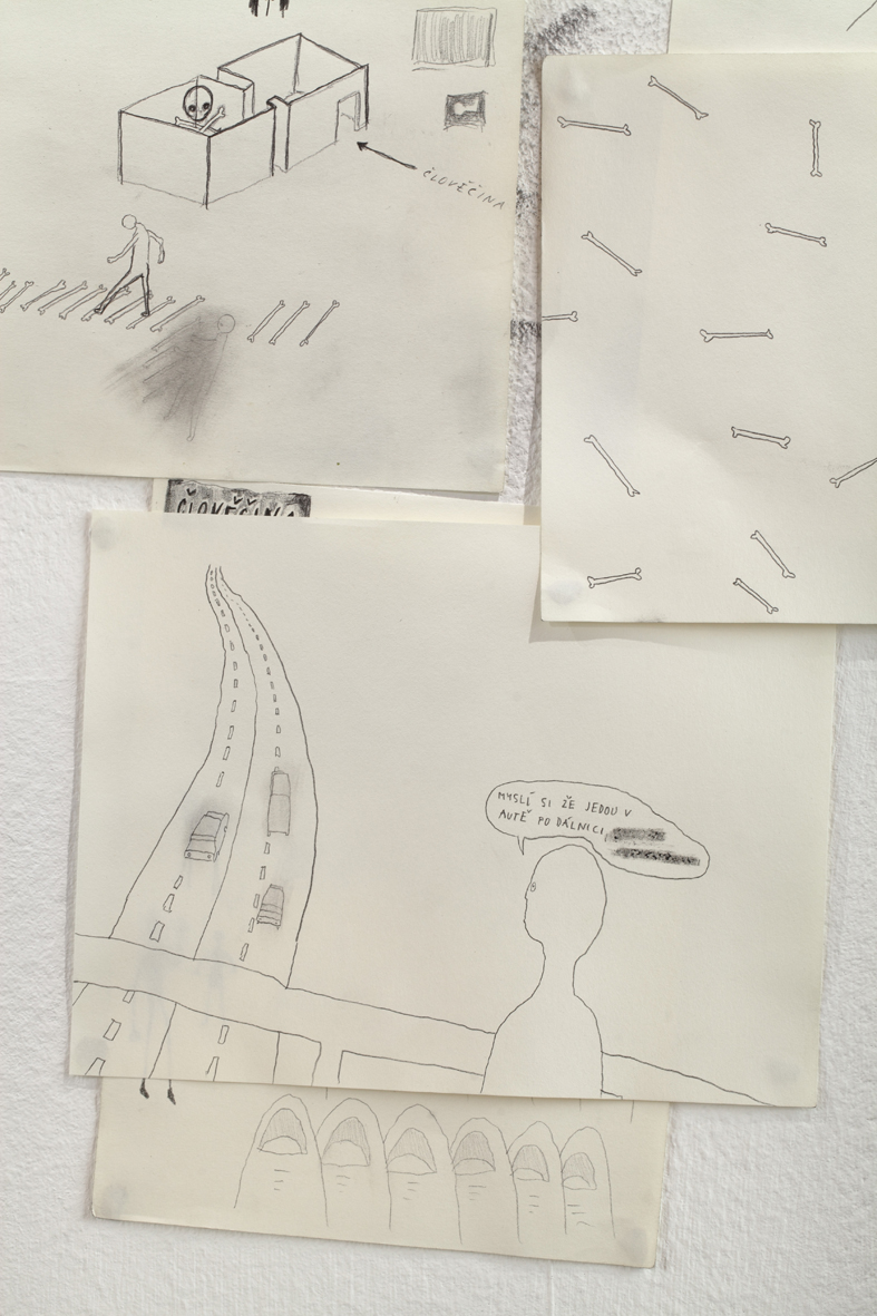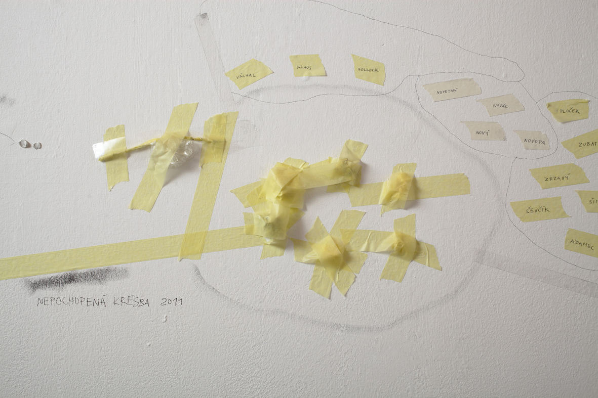 Dobrovolně a zevnitř uzamčený autor tvaru, jenž se této činorodé izolaci podrobil, letos diplomuje v ateliéru kresby na pražské AVU, což je příznivá shoda okolností. Společně s ním jsme si totiž kurátorsky a v přátelském duchu vytyčili skromný cíl, mající podobu výstavy, jež vzniká prakticky z ničeho a během krátké doby. Odborně řečeno se jedná o takzvanou otevřenou formu, která se může organicky, neplánovaně, čili bez jistých záruk o výsledku, vyvinout naprosto libovolným směrem.