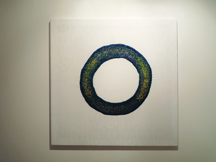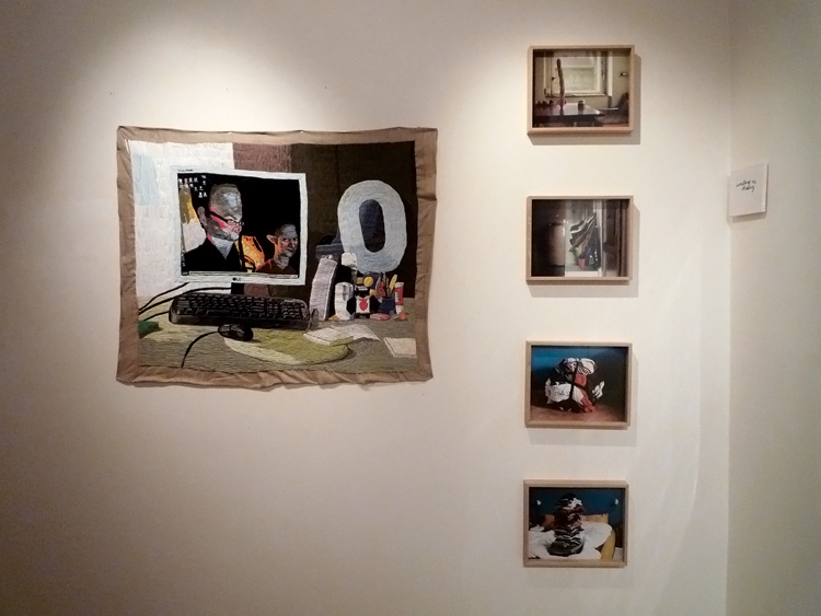 Work Space je obraz s motivem zátíší – typické pracovní plochy s počítačem – jehož nosičem je dekorativní médium výšivky. Pracnou a zdlouhavou techniku ručního vyšívání jsem zvolila proto, že tento neustále se opakující pohled, banální a každodenní situaci, bylo nutno realisticky propracovat. Jen tak mohlo vzniknout trochu absurdní napětí nebo disproporce – podobná jakou vidím v tom, když jemnými pohyby klikáme myší a děláme přitom ve fyzickém převodu zdánlivě velké věci.