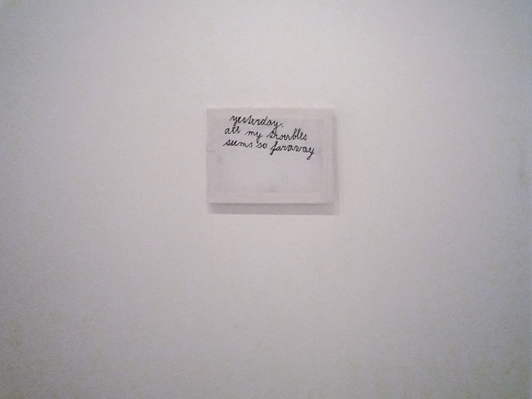 Top ten je řada drobných výšivek, jakoby rukou psané malé texty útržků refrénů písní z rádia, které se mi v průběhu života vypálily do mozku a vrací se mi v radosti nebo ve stresu při práci.