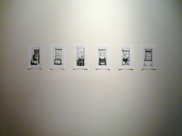 Okna je název kreseb vytvořené mojí levou rukou (byť jsem pravák). Záznamy mapují okraje bytu – všechna okna – místa, kudy je možné vyhlédnout ven. Pokaždé, když kojím své dítě, pozoruji vnější svět, chci kreslit a zrovna pravá “šikovnější” ruka není volná, protože je zaměstnaná důležitou věcí – péčí o dítě. Volná levá ruka by neměla zahálet a prostě se měla učit být stejně užitečná jako ta pravá.
