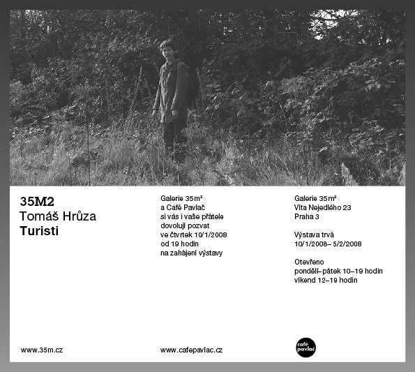 Pro galerii 35m2 vybral Tomáš několik statických obrazů z obsáhlejšího a různorodého fotografického cyklu Turisti, který tentokrát nově doplnil pohyblivým obrazem videa. Autor se dlouhodobě zajímá o téma vztahu civilizace a přírody, městského člověka a krajiny, putování divočinou a návratu zpět ke kultuře. Činí tak nenápadnou, obyčejnou a téměř meditativní formou. Na barevných fotografiích se středomořskými letovisky s jejich charakteristickou florou vidíme ospalé turisty procházející se po cestě směrem k pláži a zpět. Na přivlastněných a z reklamních lightboxů přefocených snímcích spočívají na anglické pahorkatině skupiny výletníků. Jedná se o jakési malebné a trochu nepovedené pohlednice zevšednělých rájů nebo obrazy sentimentu po neexistující romantické malbě. Jemné pocity malebnosti se v těchto obrazech vyvažují trochu posmutnělou atmosférou a lehce zneklidňujícím voyerským hlediskem.